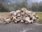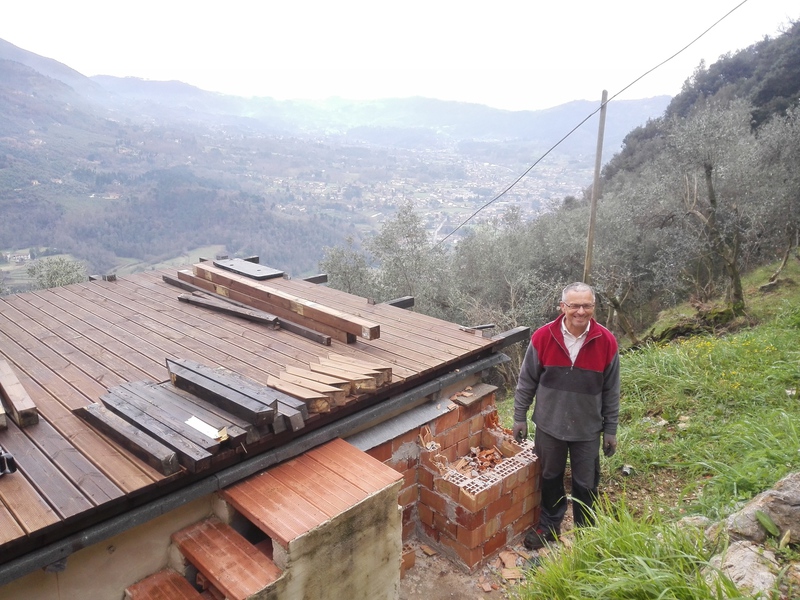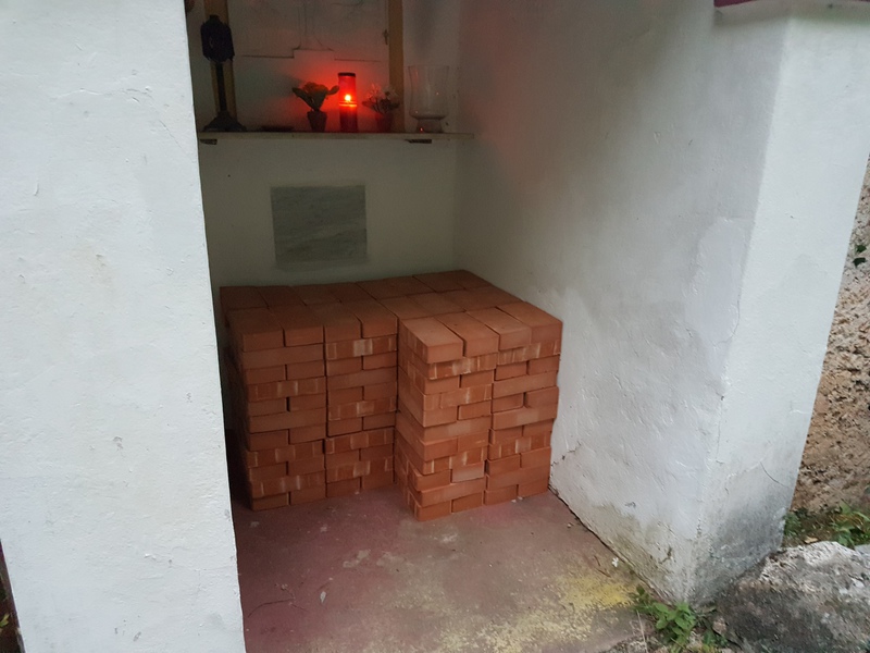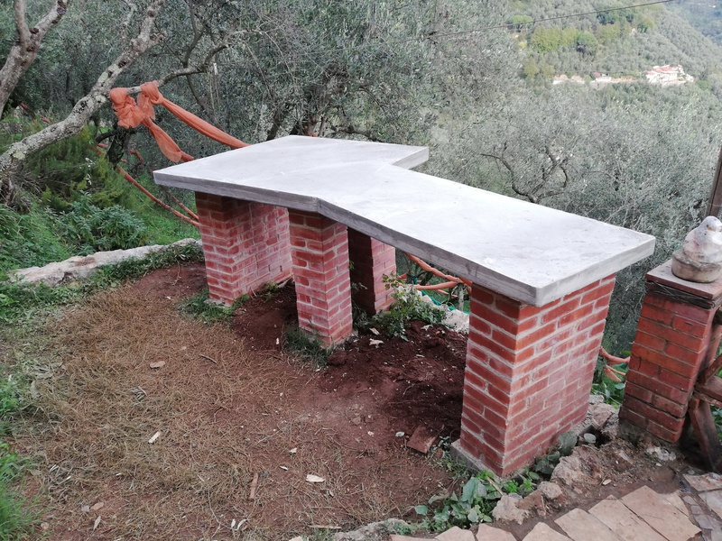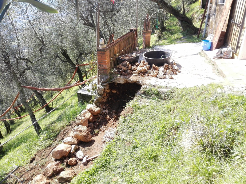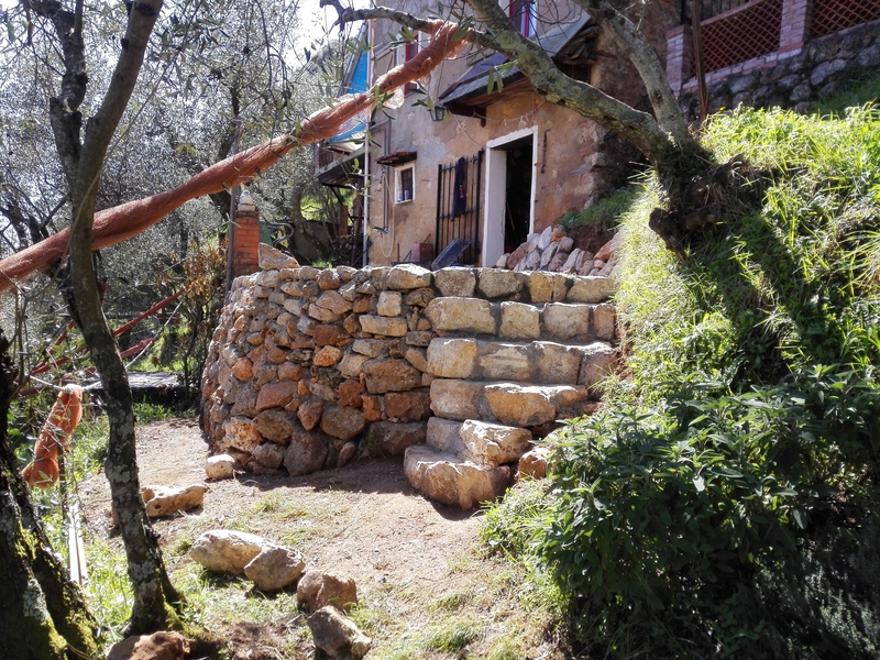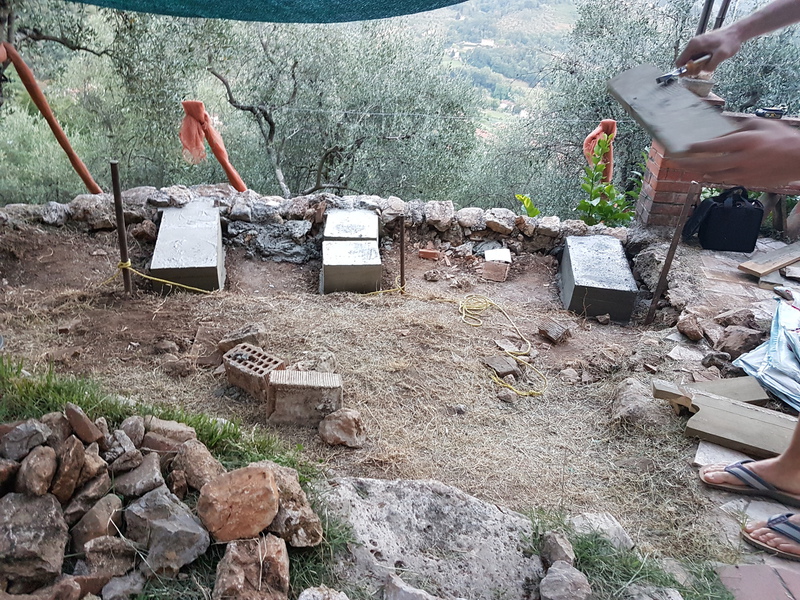 Die Terrasse für den Ofen wird gebaut. Es werden 2 Tonnen Mauersteine geliefert und dutzende Säcke an Beton besorgt. 2-3 Steine können mit der Schubkarre gleichzeitig den Hang hinab gefahren werden. Je nach Kraft auch zwischen 2 und 4 Säcke Beton. Der Ästhetik der Mauer nimmt sich Niko an, jeder Stein liegt gut auf dem anderen. Elena hilft teilweise, aber primär suchen sie und Martin Füllmaterial für die Terrasse. Gut, dass bei Casa Berti gerade ein paar Konstruktionen abgerissen werden müssen… Ein bisschen Erde kann hier und dort im Olivenhain auch noch geschürft werden, hierbei muss aufgepasst werden, dass es dadurch nicht zur Destabilisierung der Hänge kommt.
