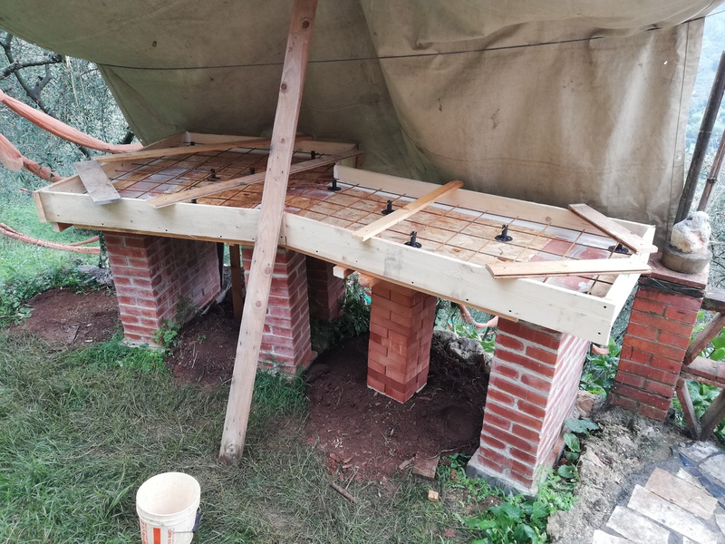 Eigentlich stand die Olivenernte an, da es aber keine Oliven gab, konnten andere Dinge angegangen werden. Fabian und Niko holen den Betonmischer von CasaBerti. Im Tal bei LaMura wird ein Armierungsgitter für die Stahlbetonplatte gekauft und dann bauen Elena und Niko erstmal drei Tage lang an der Verschalung (Schade, dass man diese am Schluss wieder kaputt machen muss) und verwenden einen weiteren Tag damit, diese vernünftig an den Stützen zu befestigen. Mit der Unterstützung von Fabian landen die Betonsäcke schnell im Mischer. Niko freut sich an der Rüttelflasche, so wird der Beton schnell glatt und fest, sobald er in die Plattform gegossen wurde. Innerhalb von wenigen Stunden ist die Verschalung komplett mit Beton gefüllt. Einen Tag später kann die Verschalung abgenommen werden, teilweise ist das gar nicht so einfach, da die Schrauben zu dicht an der Betonplatte angebracht worden (man lernt für das nächste Bauprojekt). Jetzt muss nur noch dieser Betonmischer zurück zum CasaBerti (ohje…). |