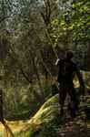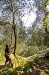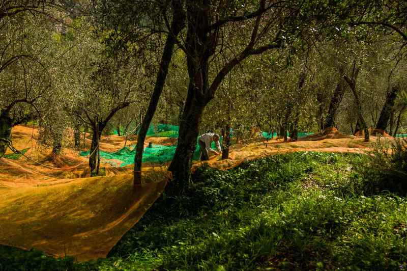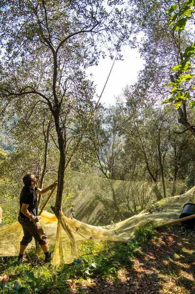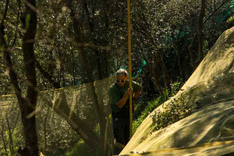 Da bei nur 35 % der Bäume Netze vorinstalliert sind, es aber auch viele gut besetzte Bäume außerhalb dieser Bereiche gibt, haben wir auch ein Handnetz, mit dem man von Baum zu Baum ziehen kann und diese einzeln abernten kann. Da das Ganze ja im Steilhang mit Terrassen stattfindet, ist es eine sehr mühevolle Arbeit.