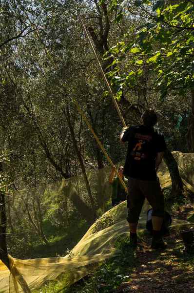 Die eigentliche Ernte erfolgt mit Bambusstöcken, mit denen die Oliven ins Netz/Netze geschlagen werden. Die Bambusstangen müssen durchgetrocknet sein und im Schatten trocken gelagert werden, sonst sind sie entweder zu schwer oder rissig. Die Stangen sind bis 6 m lang und für die „Schüttelarbeit“ braucht es genug Körpergewicht und dicke Arme.