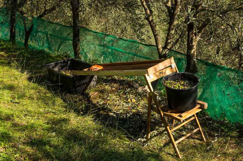Die geernteten Oliven inklusive Blätter und abgeschlagenen kleinen Zweigen werden mit Eimern aus den Netzen genommen und auf einem Rollsieb ausgelesen. Das Rollsieb hat Längsrillen in denen die Oliven nach unten kullern und die Blätter durchfallen. Faulige Oliven müssen mit der Hand ausgelesen werden. Wenn zu viel faulige dabei sind, dann schmeckt das Öl später nicht.