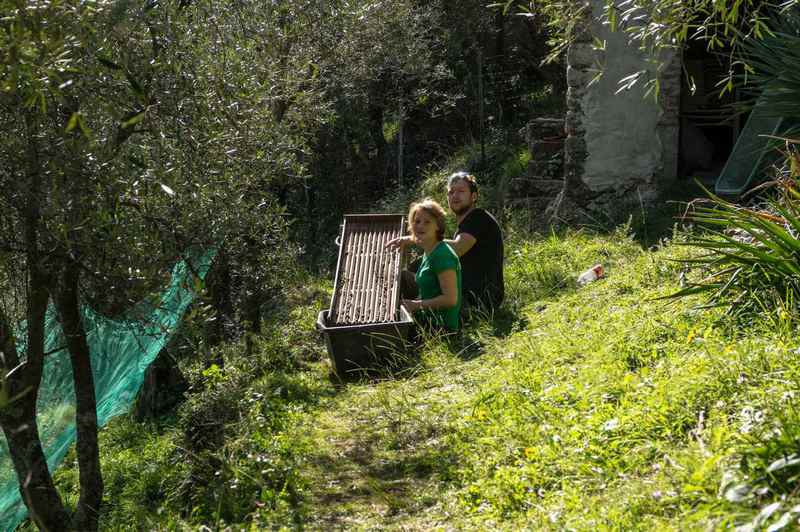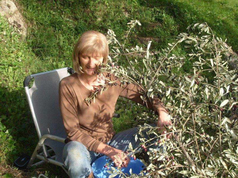 Die geernteten Oliven werden in diversen Plastikwannen gesammelt. Nach 3 - 4 Tagen Ernte ist man normalerweise erschöpft und will nicht mehr. Dann füllt man die Oliven in Säcke, diese schleppt man ins Auto (Schubkarre) und fährt das Ganze zur Olivenmühle in Lombricese (unten im Tal). Dort kippt man die Oliven in einen großen Plastikkorb, der dann mit dem Gabelstabler hinten auf den Lagerplatz (erhöht, ca. Dachhöhe der Mühle) gefahren und dort gewogen wird. Dann die spannende Frage: hat man genügend Oliven (200 kg) für eine Eigenpresse?
