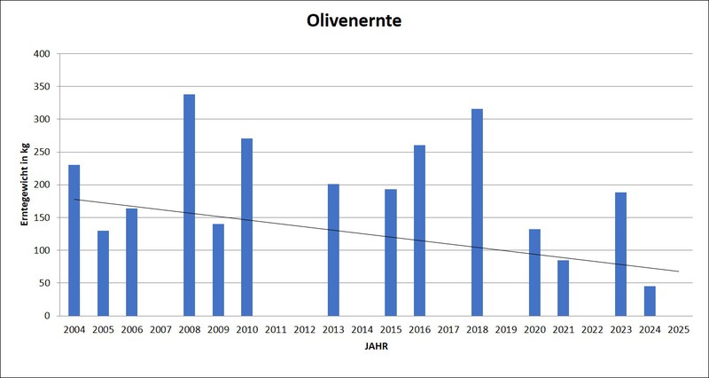 Tja, Grundvoraussetzung ist erst mal, dass nennenswerte Mengen an Oliven dranhängen. Das ist keineswegs immer gegeben. Es gibt Jahre, da spielt das Wetter zur Zeit der Bestäubung (Olivenblüten werden durch den Wind bestäubt) nicht richtig mit und wenn wenig dran sind, dann hat die Olivenfliege nur wenige Kandidaten zum Anbohren, d.h. wenn wenig dran sind, dann sind alle ein oder zweimal angebohrt, frühreif, faul und frühzeitig abgefallen. In einem der Bilder kann man die Erntestatistik sehen.